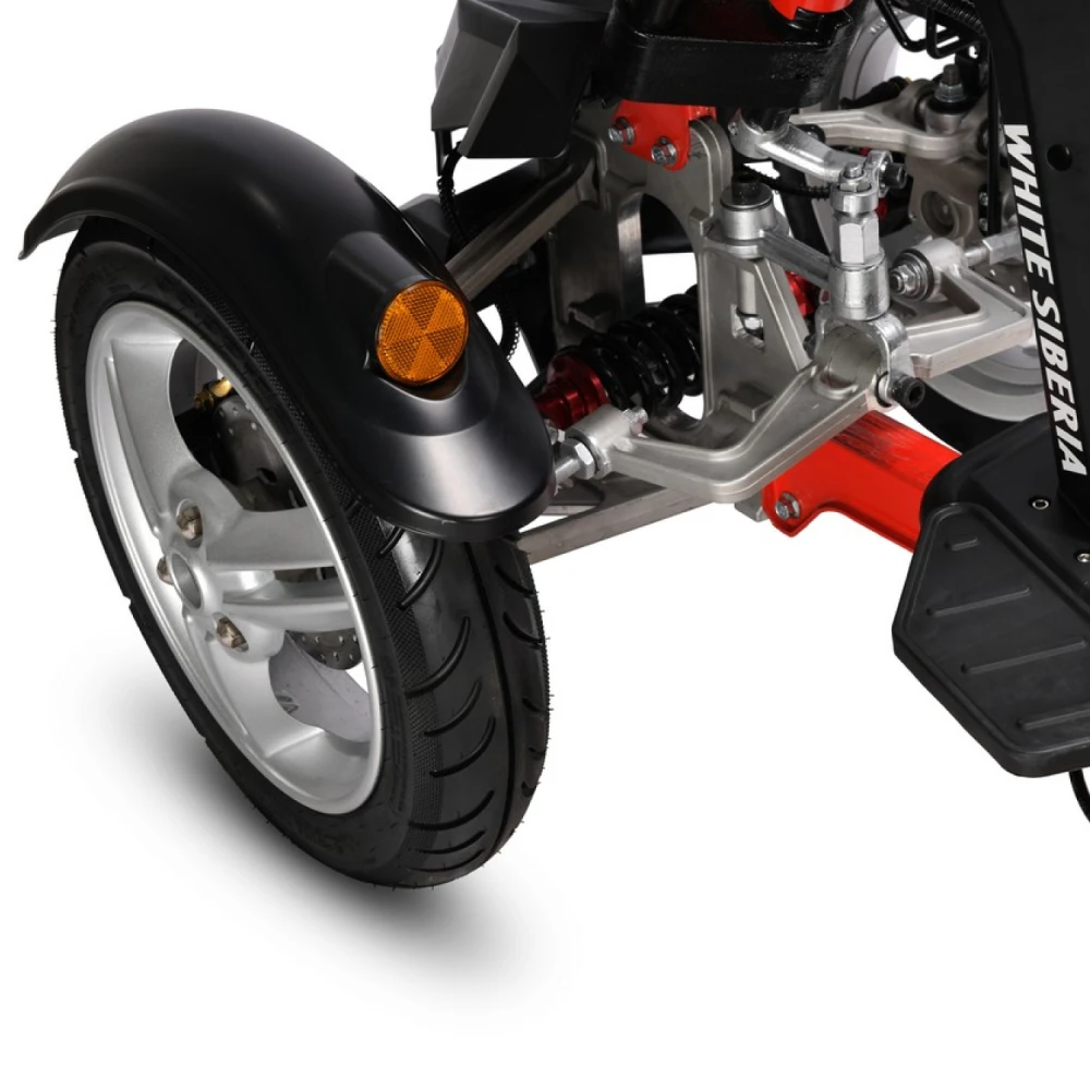 Двухподвес пружинно-масляного типа и 12" колёса с широкой шиной сглаживают неровности и повышают управляемость.