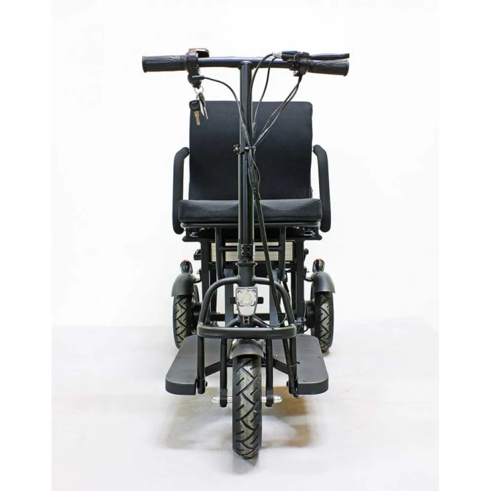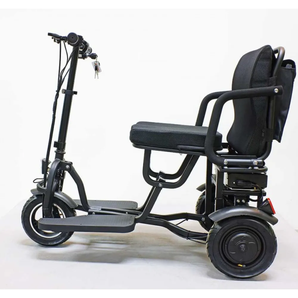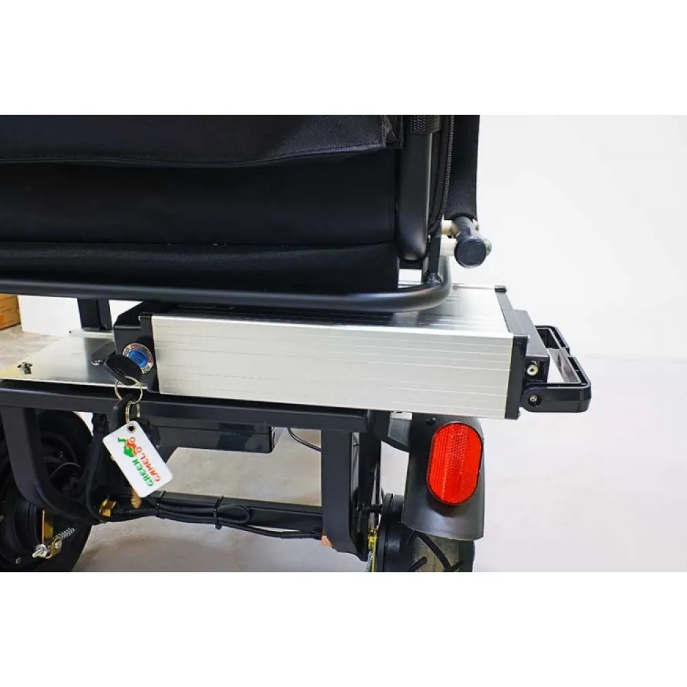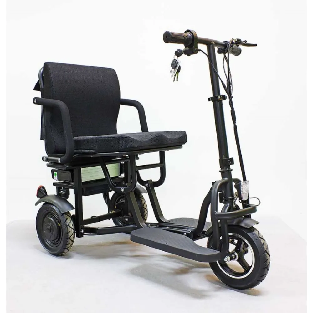 Водительское сидение широкое, имеет специальное воздухопроницаемое покрытие, позволяет длительное время находится в дороге. Техника представлена складной конструкцией, дает возможность легко транспортировать и брать с собой в путешествие. Мощность надежного двигателя 700 Вт позволяет развивать максимальную скорость 25 км/час за короткий период. Заряда емкого аккумулятора достаточно для прохождения 20 км пути без подзаряда. Современная технология изготовления батареи позволяет быстро заряжать, рассчитана на 1000 циклов заряда/разряда.