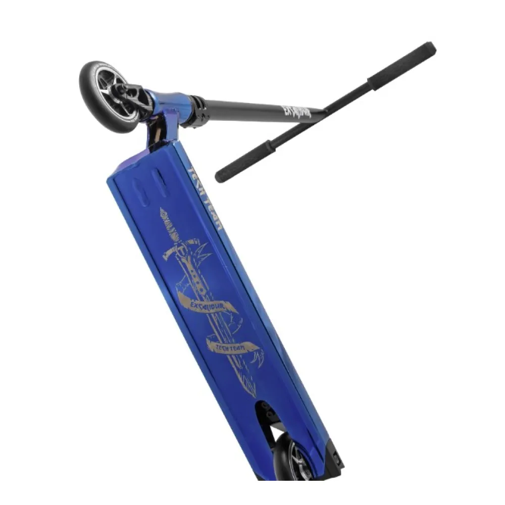 Новая модель самоката от Tech Team была названа в честь легендарного меча короля Артура  - Эскалибур. Его изображение нанесено на дно деки самоката и не сотрется при катании. Размеры деки 52 см в длину и 12 см в ширину. За передним сидением дека заварена, а сзади имеет квадратные кропа.  Руль самоката собран в классический образ буквы «Т» и изготовлен из прочной стали CrMo 4130. Высота руля 67.5 см и ширина 60 см. На руле установлены мягкие и удобные грипсы. Все детали самоката соединены трехболтовым зажимом рулевой системы HIC. Колеса состоят из полиуретана и имеют классический размер 110 мм. Модель EXCALIBUR оснащена подшипниками класса ABEC 9 Chrome. Они имеют высокую прочность и сохраняют набранную скорость. Сам самокат сделан из алюминиевого сплава и выпускается в двух хромированных цветах – серебристый и синий. Модель подходит для детей от 7 лет и желательно для тех пользователей, кто катает не первый год. Для безопасности над задним колесом установлен гибкий ножной тормоз.