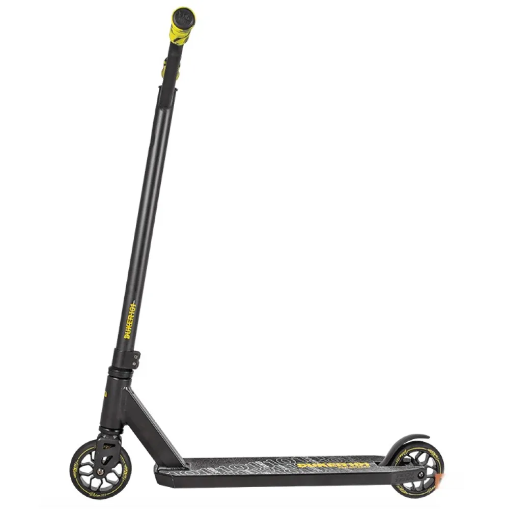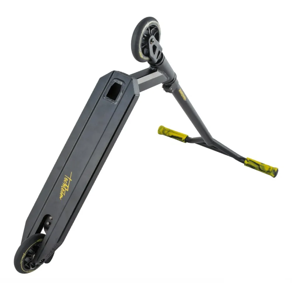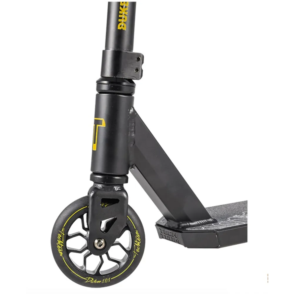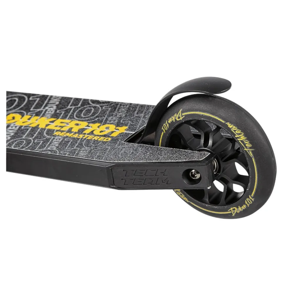 Трюковой самокат Techteam TT DUKER 101 2020 Черный - надежная и качественная модель для начинающих пользователей старше четырех лет. Производители использовали самые качественные материалы, чтобы обеспечить надежность и безопасность транспортного средства. Стальной руль высотой 58 см и шириной 50,5 см имеет надежное крепление системой HIC с зажимом на двух болтах. Стальная вилка также характеризуется высокой прочностью, получив при этом обновленную изящную форму. Полиуретановые колеса на алюминиевых дисках имеют оптимальный диаметр 110 мм и ширину 24 мм. Для данной модели производители предусмотрели качественные подшипники ABEC 9, которые гарантируют хороший накат и комфортный тихий ход. Алюминиевая дека с пластиковыми накладками на боковых гранях отличается высокой прочностью и выдерживает нагрузку до 100 кг. Ее поверхность покрыта мелкозернистой шкуркой, на которой нанесен рисунок с названием самоката. Противоскользящее покрытие позволяет райдеру сохранять устойчивое положение при выполнении различных элементов трюкового катания. Трюковой самокат Techteam TT DUKER 101 2020 сочетает в себе высокое качество материалов и сборки и стильный современный дизайн.